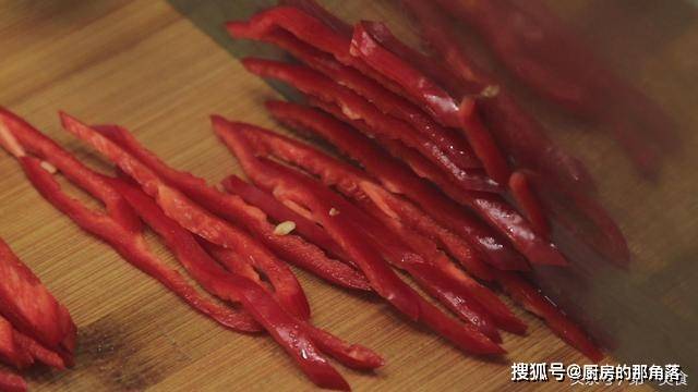 红椒半块去籽以后斜刀切成细丝。