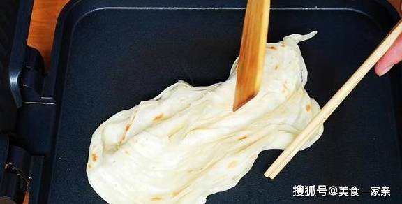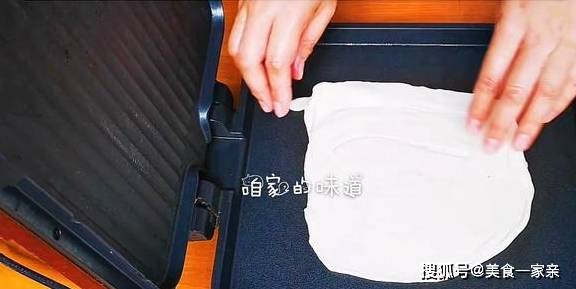 6.电饼铛选择薄饼模式预热好,把饼放进去,30秒饼变色就可翻面,再烙30秒就可以出锅了,这个饼非常薄所以很快就熟,如果想吃口感酥脆的可以多烙一会儿。