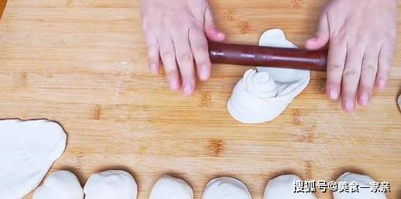 4.从第一个剂子开始做,按扁后擀成长方形的薄片,刷上一层油酥,像叠扇子一样折叠起来,从一头卷起,边抻边卷,最后尾部用擀面杖擀开,收在下边,用手按压形成饼胚。