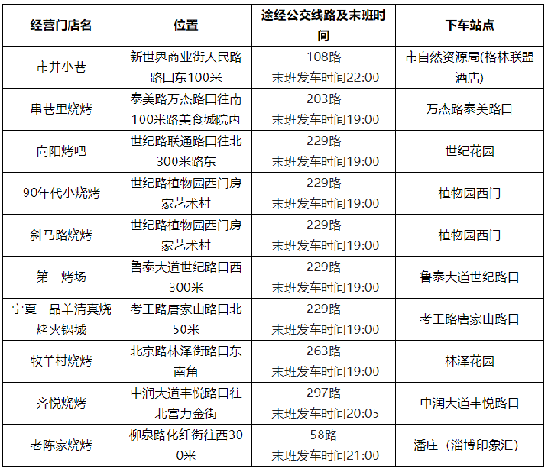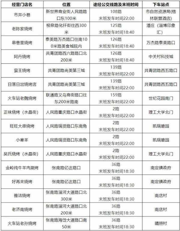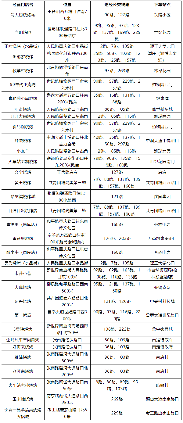 淄博市张店城区共42条常规公交线路可覆盖33家烧烤店,途经各烧烤店的常规公交线路明细如下: