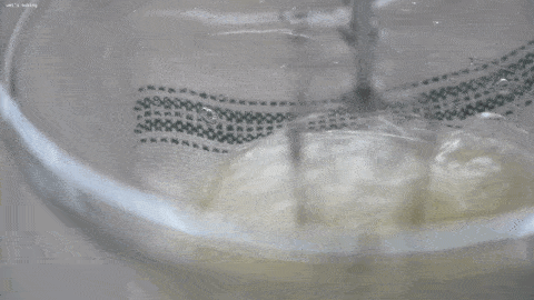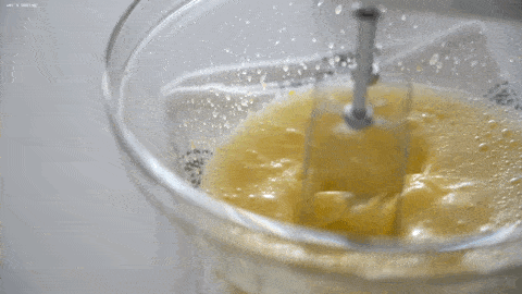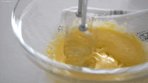 在料理碗中放入45g蛋黄和18g糖打发;加入32g水和18g食用油继续打发,打发至有小泡沫即可