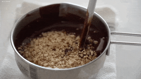 取300g黑巧克力豆和110g食用油,隔热水融化巧克力;倒入75g扁桃仁碎拌匀,等巧克力溶液降至室温