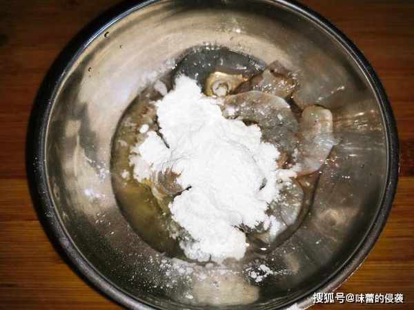 3、剥好的虾仁里边放入料酒,食盐,适量的淀粉以及一点鸡蛋清用筷子拌匀腌制10分钟。?