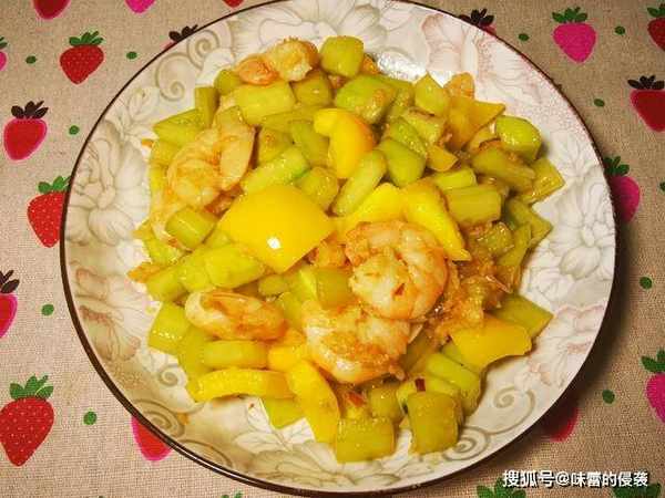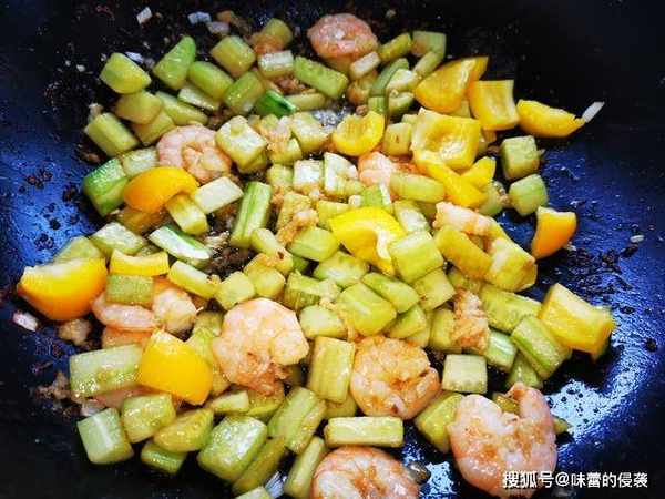 7、放入切好的彩椒,大火翻炒30秒钟即可,时间不用太长,虾很容易成熟,而黄瓜本身就可以生吃的。