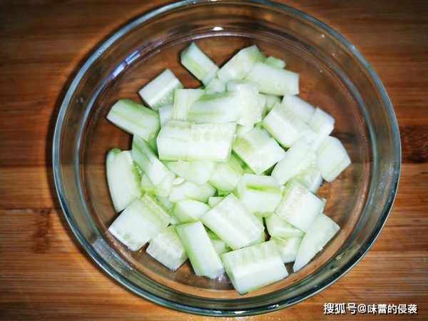 1、首先我们将黄瓜洗净,去掉皮,也可以不去皮,切成小块状,装入碗中备用。?