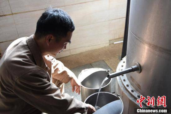 工人在接收蒸馏出来的原酒。王宇 摄