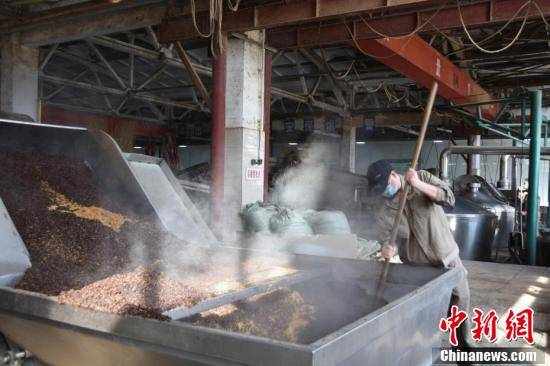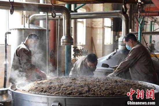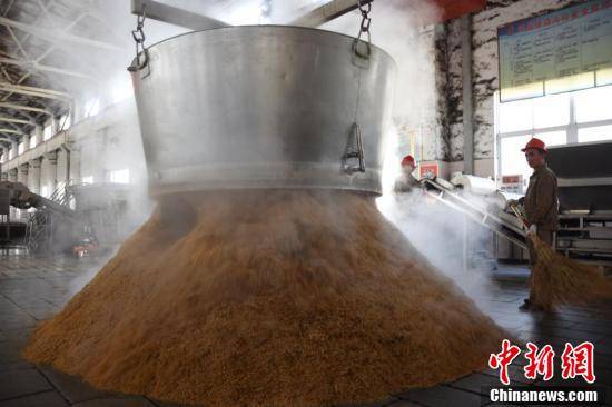 工人在蒸制酒糟。王宇 摄