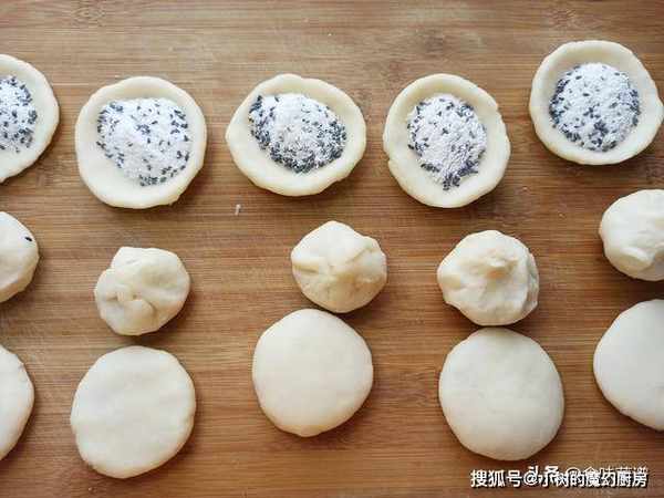 7、用掌心把剂子按压扁,团成一张四周薄中间厚的面皮,用勺子舀入适量的糖馅,收口捏紧,防止露陷。