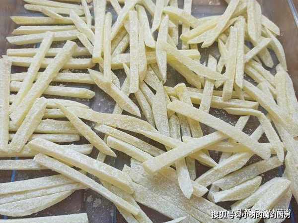 4、淀粉无需裹太多,码放在托盘中,放入冰箱冷冻2个小时,这样炸的薯条,出锅更脆一些,口感也更好吃,不易断裂。