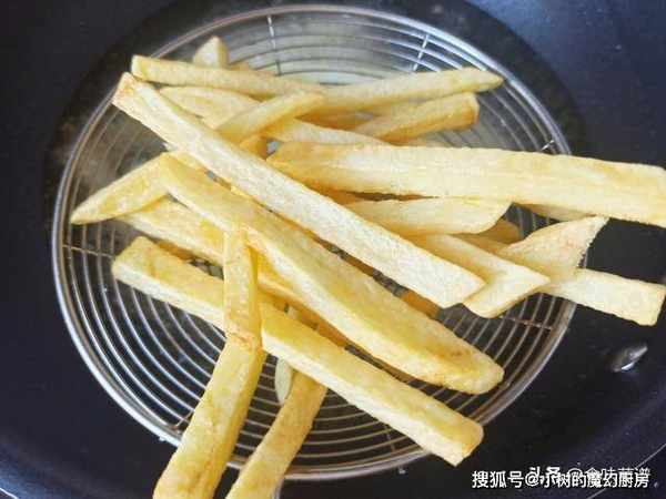 6、接着进行二次复炸,这样做是为了提升酥脆度,把油温升高7-8成热,再次下入薯条,复炸至金黄色,即可捞出。