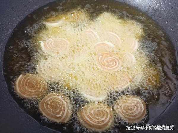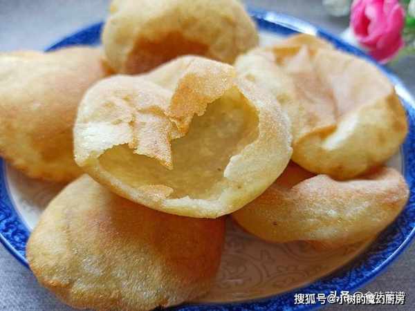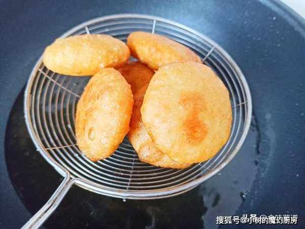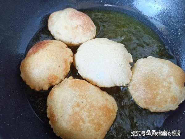 8、这样的饼皮,遇到高温,会迅速鼓包,等待全部上浮,变成金黄色,即可出锅。