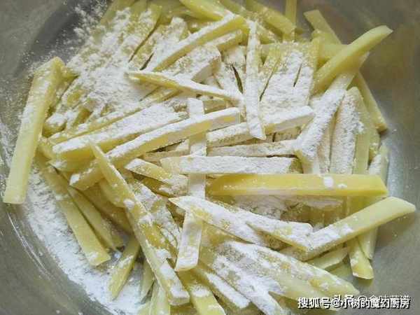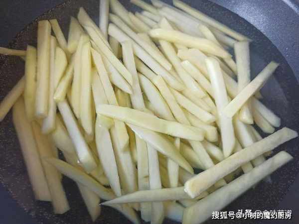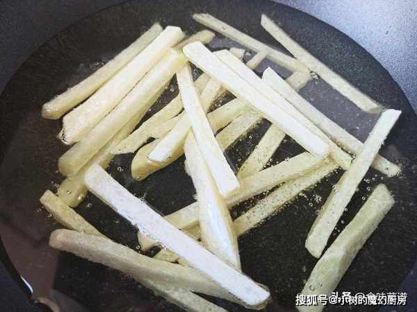 5、锅内倒入适量油,等待5成热的时候,下入薯条,炸至全部上浮,颜色偏黄的时候,控油捞出。