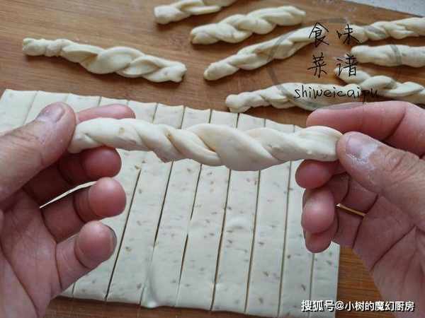 7、将面皮切成长条,间隔距离1厘米,取一根长条,旋转上劲,然后对折一次,再拧一遍,一个麻花的生胚就做好了。