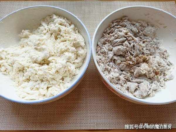 1、准备两碗面粉,其中一份用红糖水和面,边倒边搅拌,另一份用纯牛奶和面,全部搅成大面絮的样子。