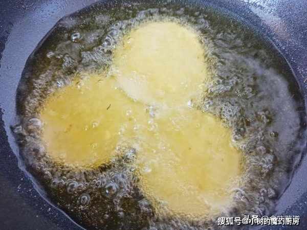 9、做好之后,锅内加入适量油,等待油温3成热时,下入饼胚开始炸,等到定型后开始翻面,中间多翻动几次,确保受热均匀。