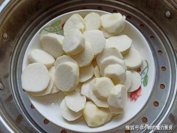 2、芋头的黏液会刺激皮肤,操作时可戴上一次性手套,避免手部发痒,去皮洗净,切成均等的薄片,上锅蒸15分钟。