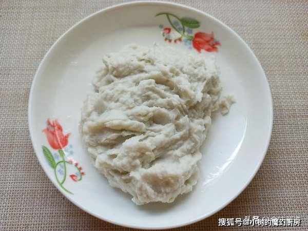 3、蒸好之后,趁热压成细腻的泥,根据个人口味加入白糖,不吃甜味的可忽略。