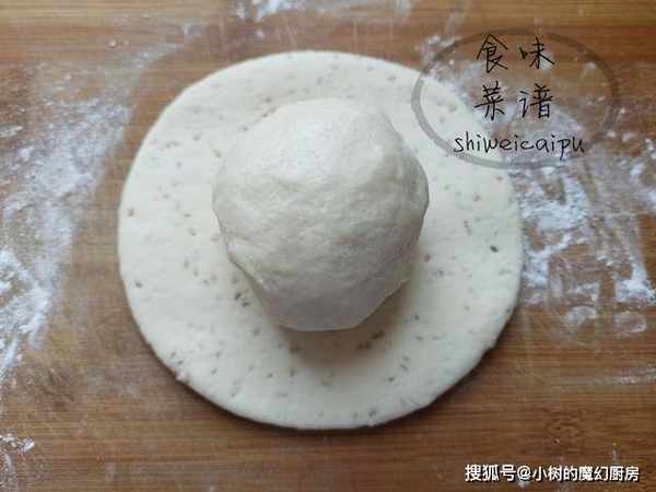 6、包好之后,用掌心将“圆球”按扁,擀成一个长方形的面皮,接着从右边慢慢卷起来,再次擀开。