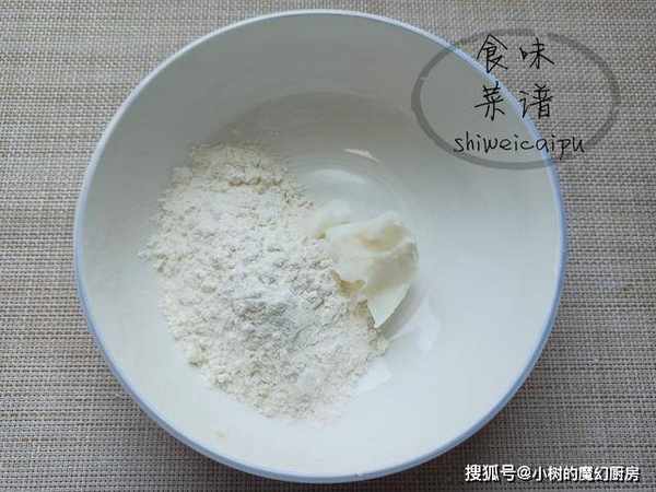 3、另外制作一块酥面,碗中倒80克面粉,30克猪油,也可用其他食用油替代。
