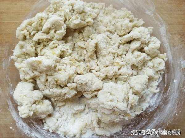 4、一直搅到没有干面粉,样子呈絮状,准备开始揉面。