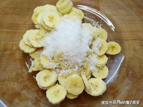 2、香蕉剥掉外衣,然后切成薄片,加入两勺白糖,用勺子底压成香蕉泥。