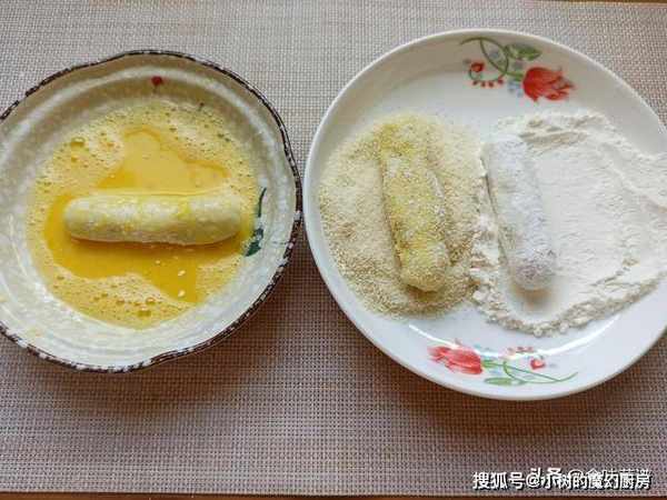 6、把搓好的芋头泥,按照步骤顺序,先裹一层面粉,再裹一层鸡蛋液,最后裹上一层面包糠,面包糠能让成品更酥脆。