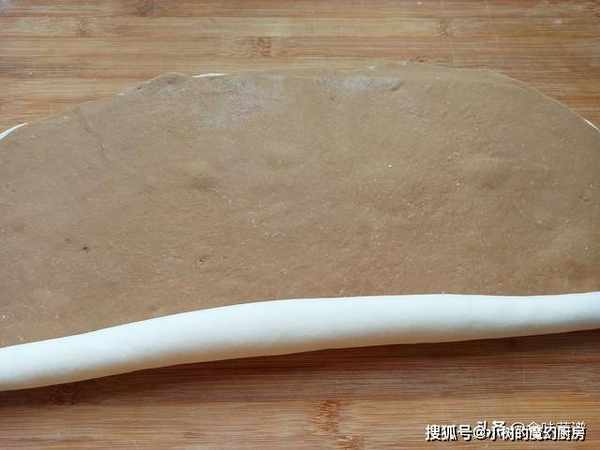 3、饧好的面团,从里往外擀,分别擀成两张薄薄的大面皮,白色铺在下面,两张重叠在一起,从下往上卷,按压结实。