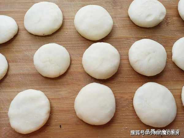6、取出一个面剂,在案板上团一下,用掌心反复按压,用擀面杖擀成一张薄饼,厚度大约0.3厘米。
