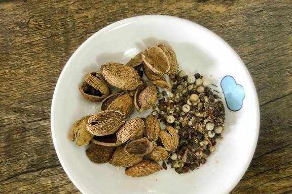 第二步:把春砂仁和胡椒粉压碎备用,生姜去皮洗干净后切成片备用。