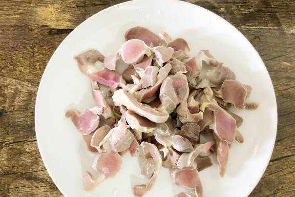 第四步:把鸡杂用清水浸泡片刻,再用刀子切成薄片备用。