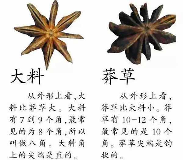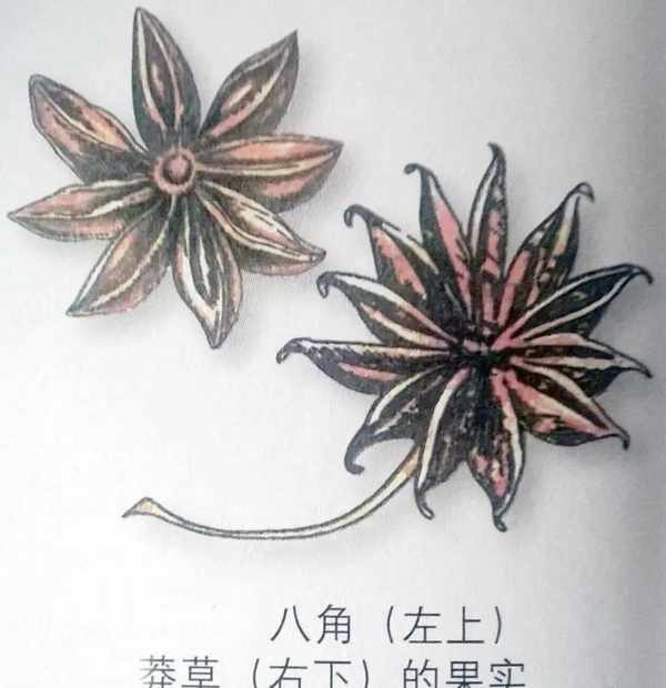 八角香味浓郁,尝一下是回甜的;莽草带有花露水或者樟脑的香味,尝一下味道是酸的,舌头有麻木感。
