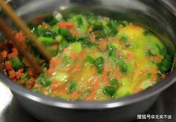 1.切点葱花、胡萝卜丁放在一起,加入食盐2克,鸡精2克,十三香1克,再打入一个鸡蛋,用筷子充分打散;准备火腿两根,对半切开再切成长条。