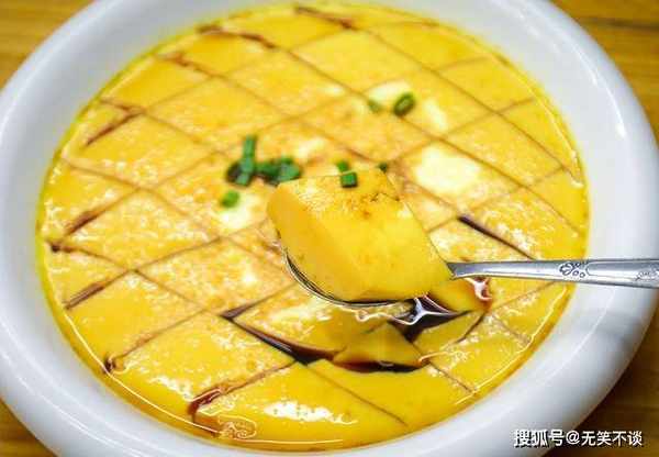 4.蒸到第4分钟的时候掀一次锅盖放放气,这一步也能有效防止形成蜂窝,8分钟以后把蛋羹取出来,直接用刀切成小块,淋上生抽、芝麻香油,撒上葱花,这道细腻丝滑的鸡蛋脑就做好了。