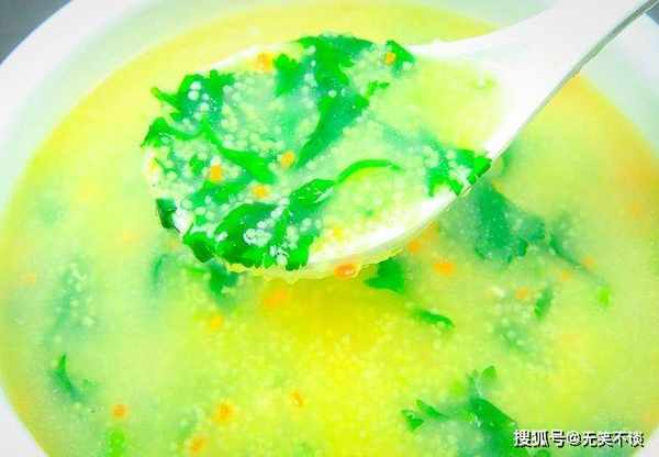 3.小火煮10分钟,煮至小米变软,加入食盐4克,鸡粉2克调味,随着煮制的时间越来越长小米粥会慢慢煮至粘稠,这个时候用勺子搅动避免糊底,出锅前放入准备好的芹菜叶搅拌均匀即可,美味即成。