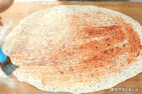 3.1个小时后面团已经发至两倍大,里面出现大小不一的小孔,说明面团已经发好,在案板上撒上面粉,取出面团多揉一会排排空气,揉好之后把面团擀成椭圆形的大面片,涂上压碎的豆腐乳。
