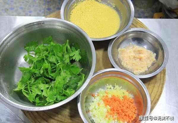 1.准备适量的新鲜芹菜,摘下一点嫩的芹菜叶放在盆中清洗干净。一点小米,提前用清水浸泡,多泡一会儿更容易煮熟。再切一点姜末、葱花、胡萝卜粒、鸡肉丝备用。