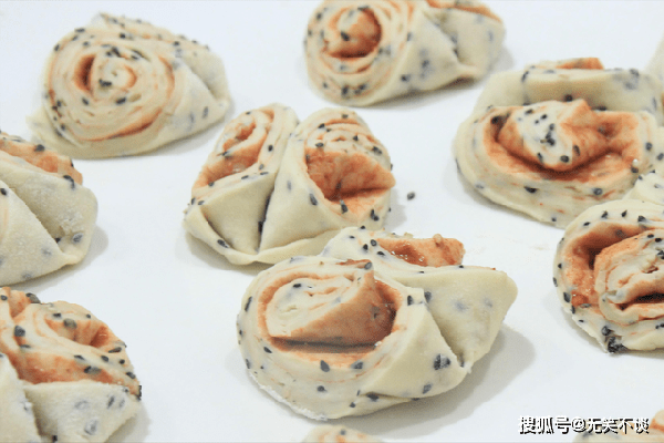 4.涂好之后从底部开始慢慢往上卷,卷成长条再斜刀切成大小均匀的面剂子,用筷子在面剂子中间压一下,压出花型,剂子要切成梯形,这样压出的花更漂亮。