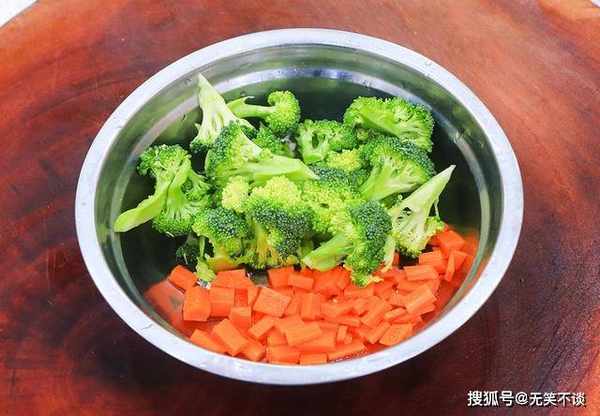 2.小葱头几根切成段,胡萝卜半根切成丁,西兰花把根茎去除,切成小块 放入清水中洗干净,再准备几粒干香菇,用热水泡发。