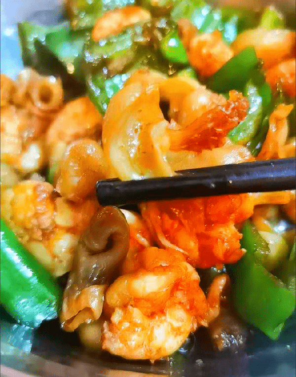 时间到了后再大火收一下汁,然后放入青、红椒块,继续翻炒至青、红椒断生后,即可关火出锅,美味即成,真香啊!