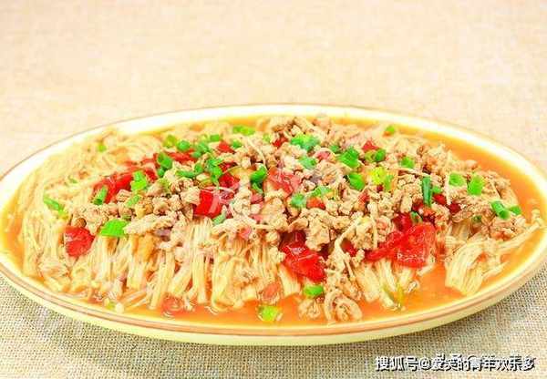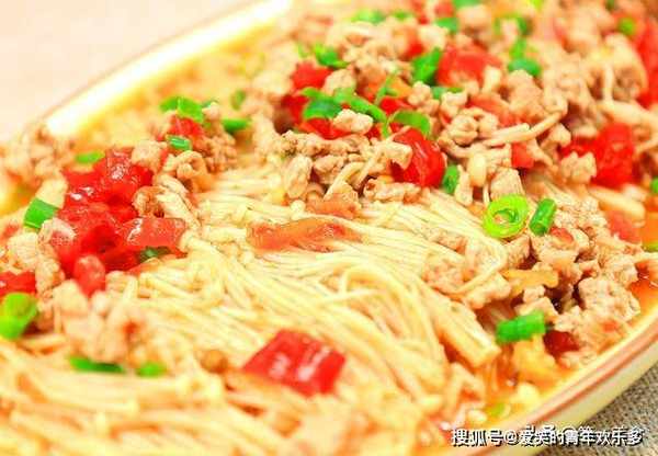 调味,盖上锅盖继续焖煮,肉粒煮熟以后即可出锅,把金针菇摆放在盘中均匀浇上肉汤,撒上葱花,一道简单易学的肉末金针菇就做好了。