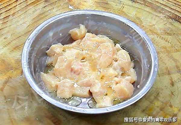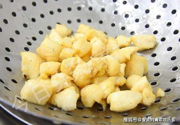 锅内烧油,油烧至5成热,把鸡肉丁倒入锅内,这个时候要用中火,有粘连的鸡肉用勺子轻轻打散,炸1分钟左右,炸至鸡肉微黄就可以倒出控油。