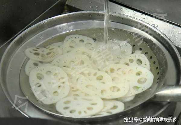 ,植物油可以使藕片更加油亮,防止营养流失,水烧开以后把藕片倒入锅中,焯水30秒钟,藕片断生以后立即倒出来,并用凉开水冲洗降温,保持藕片脆嫩的口感。