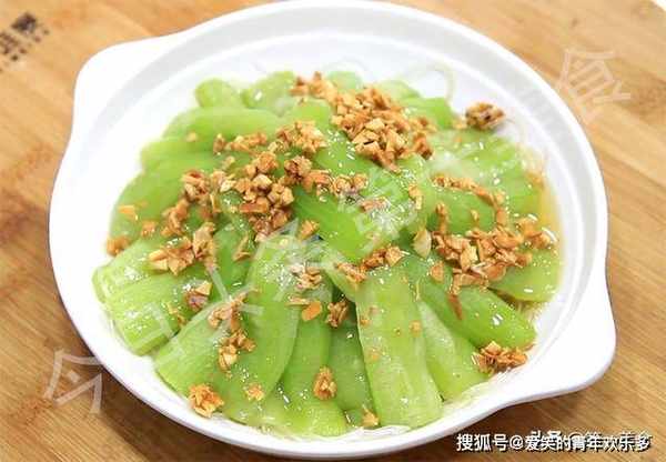 ,铺上泡软的粉丝,把炸好的丝瓜摆放在粉丝上面,全部摆好以后把金蒜均匀浇在丝瓜上面备用。