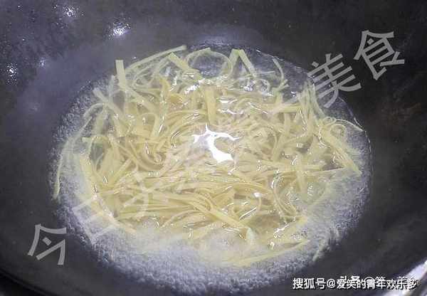 入底味,食盐还能增加豆腐皮的筋性,大约煮1分钟去一下豆腥味,把豆腐皮倒出来用清水冲洗几下,控水备用。