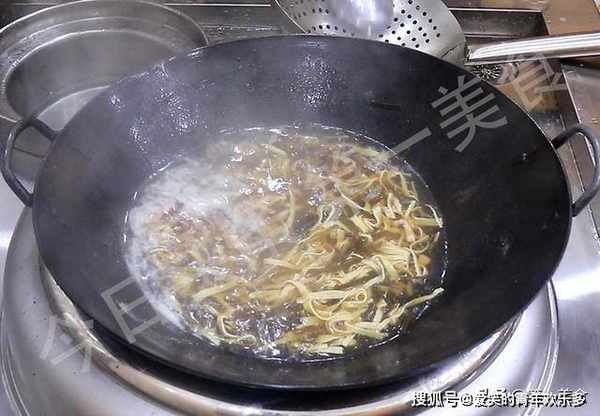 锅内烧油,充分滑锅以后倒出热油留少许底油,放入肉丝煸炒一会儿,肉丝炒白、炒香以后倒入海带丝,加入