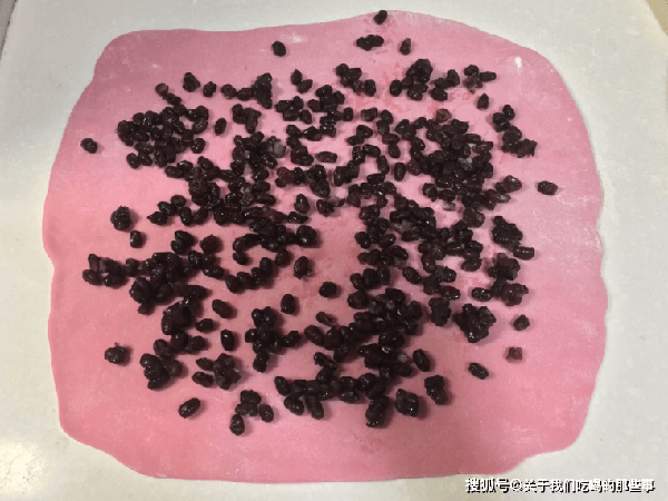 3、把面团放在案板上擀成一张薄面片,均匀地撒上蜜红豆,从下往上卷起来,两头捏紧后放入模具中,放在温暖的地方继续发酵20分钟。