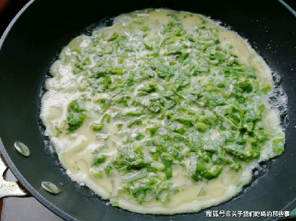 3、平底锅倒入适量油,舀入苋菜鸡蛋面糊,用铲子摊平,小火煎至定型,翻个面后继续煎,等到两面都金黄后即可出锅。