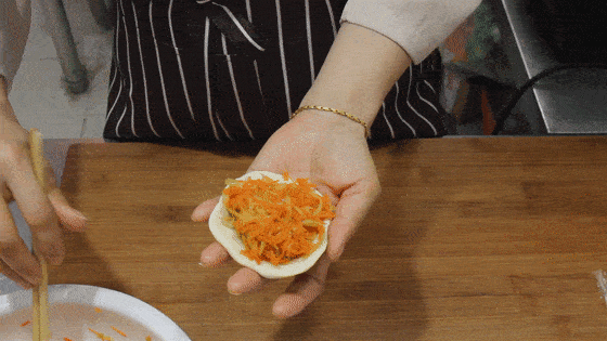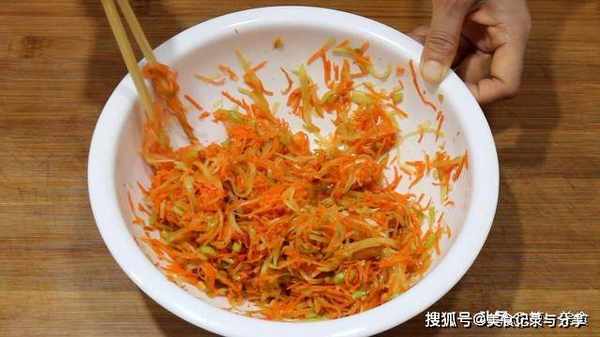 趁着饧面的时间,我们把大葱切成葱花。莴笋削皮后,先切成薄片,再切成细丝,胡萝卜也擦成细丝,全部放在一起。加入食盐3克,用手抓匀腌制5分钟,把胡萝卜和莴笋中的水分腌出来,以免烙制的时候出水。5分钟以后,胡萝卜和莴笋已经变软了,把它们捞出攥干水分。淋入一点植物油,再加入五香粉2克、生抽5克,翻拌均匀后,馅料就调好了。