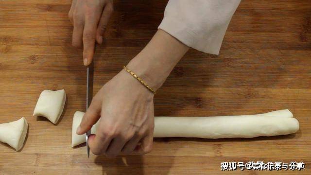 面团经过1个小时的饧制,已经变得非常的柔软了。我们把它取出搓成长条,切成8到10个左右的面剂子,然后把面剂子用保鲜膜盖住,防止受风变干。在案板上刷上植物油,把面剂子取出在手心处团成圆面坯,然后把圆面坯摁扁,整理成中间稍厚边缘稍薄的圆形面片,这样包制的时候不容易露馅。