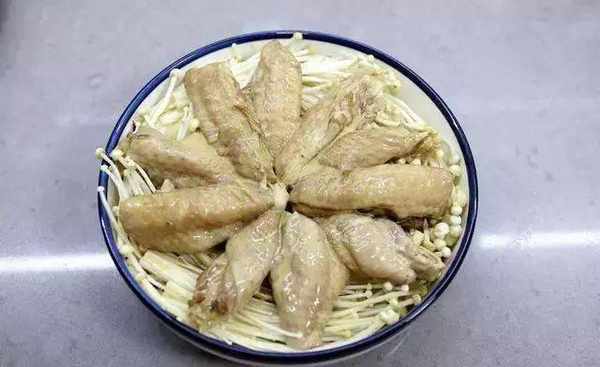 2. 盘中无需放水,因为金针菇中含有水份,蒸后会出汤;腌鸡翅的料汁如果觉得不够咸,可以出锅后再淋少许生抽,这样金针菇就有味道了;